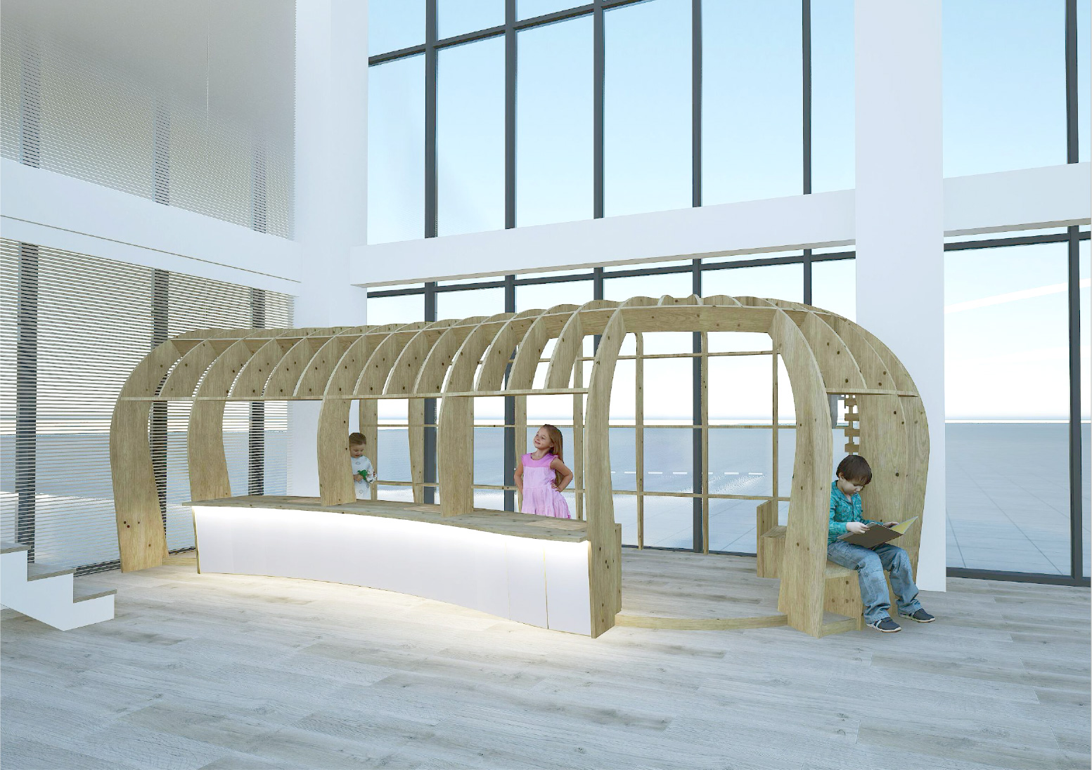 運転席でハンドルがにぎれたり、エプロンをつけてお店屋さんごっこができたり、くぐって入れる入口があったりと、お子様が喜ぶ仕掛けを考えています︕